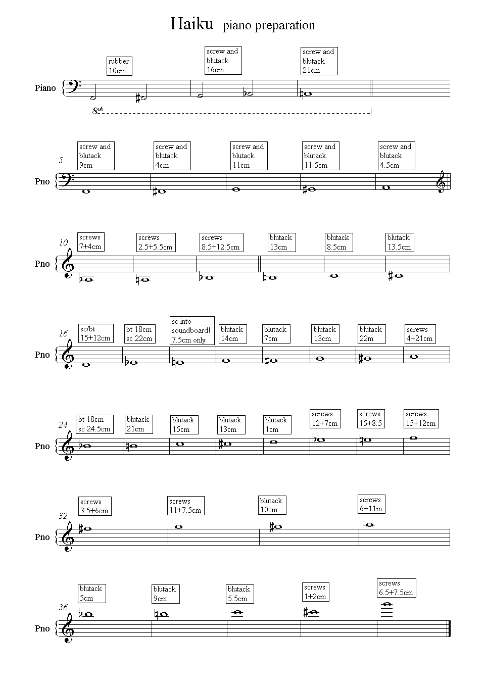 Experiment with various objects and substances. Do not force anything into the piano and be careful with it! Keep a note of your preparations. Ultimately, You will need to prepare a diagram of these. The following is one I made earlier, for a piece called Haiku: