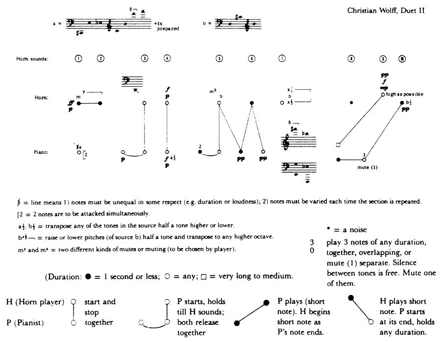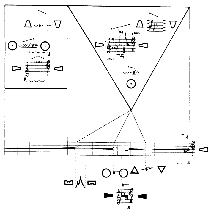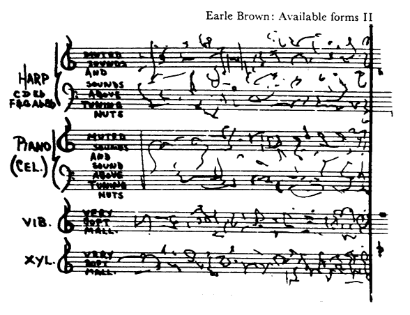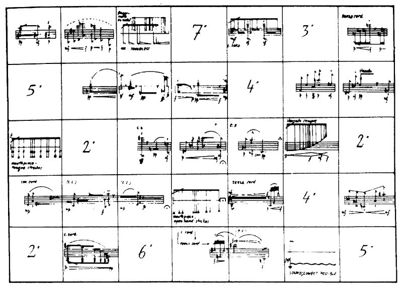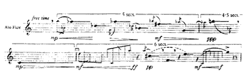 There follows a variety of examples of different forms of notation. See how well you think they communicate. Why have none of these, or, for that matter, any of the other examples of these really come into use? Or have they? Can you think of any examples which might have done? Why do you think these composers felt the need to experiment in these ways?